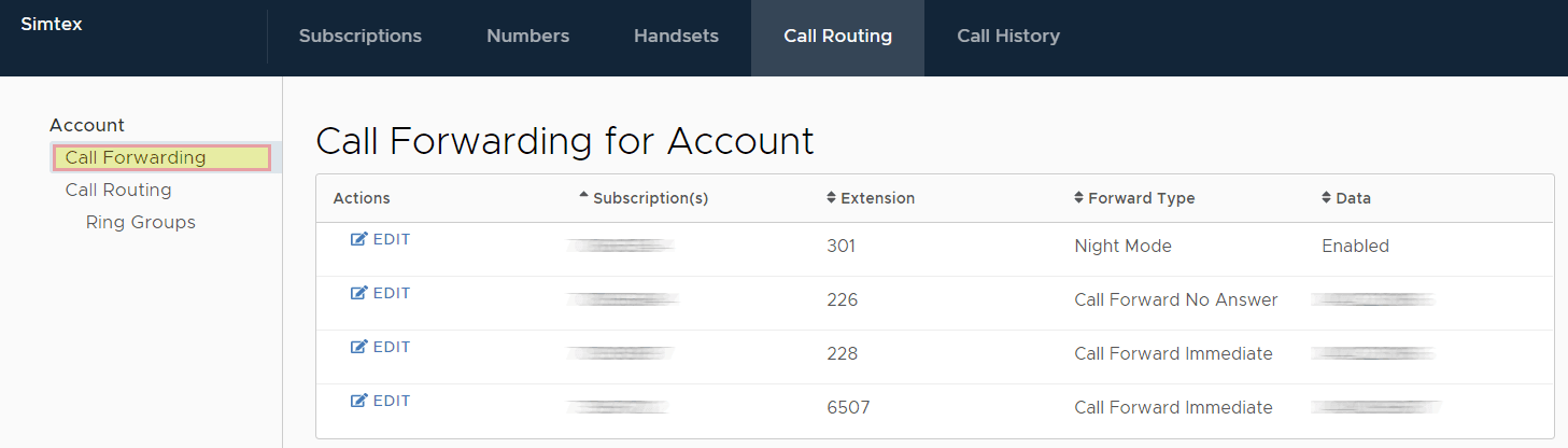- Click edit to be directed to the account Call Forwarding / Voicemail page