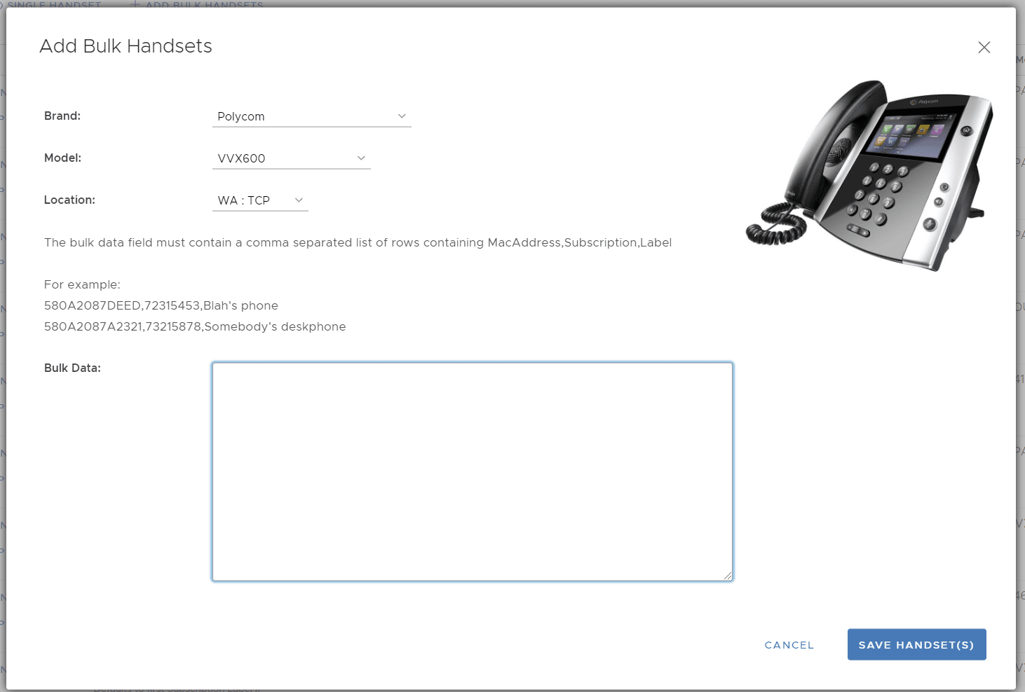 - Within the Handsets page, click + ADD BULK HANDSETS