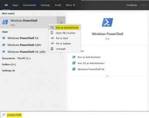 - Launch an elevated (administrator) PowerShell console by clicking Start, typing PowerShell, right-click and select Run As Administrator